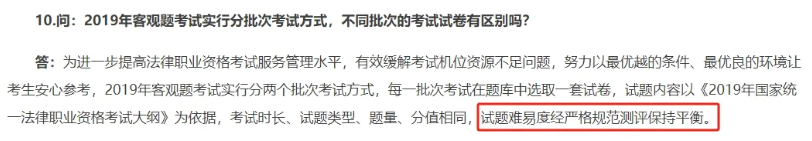 客观题考试实行分两个批次考试方式,每一批次考试在题库中选取一套试卷,试题内容以当年的考试大纲为依据,考试时长、试题类型、题量、分值相同,试题难易度经严格规范测评保持平衡。