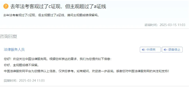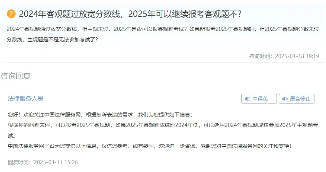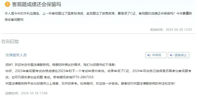 法考客观题的合格成绩保留至下一年度,主观题的合格成绩仅当年有效。